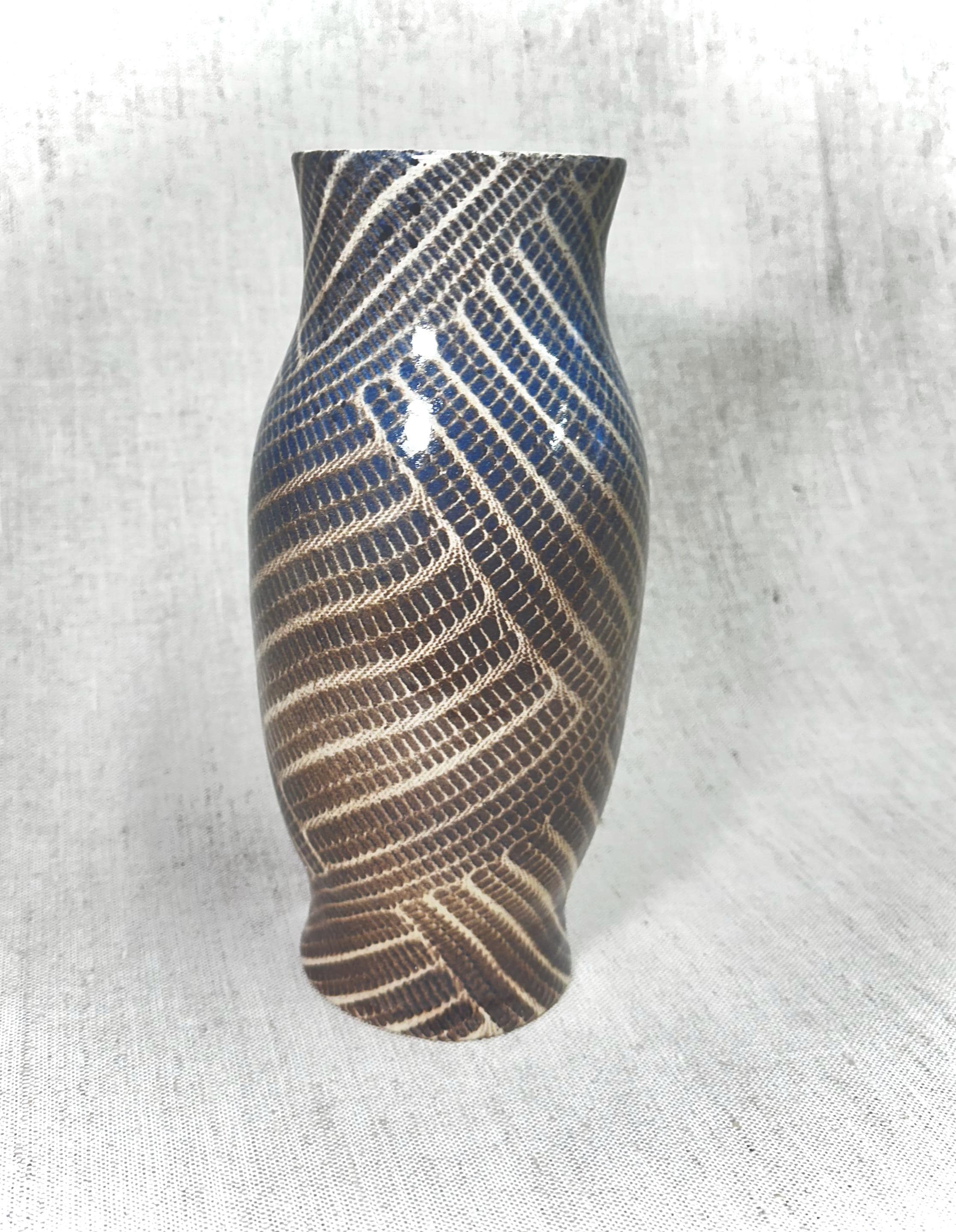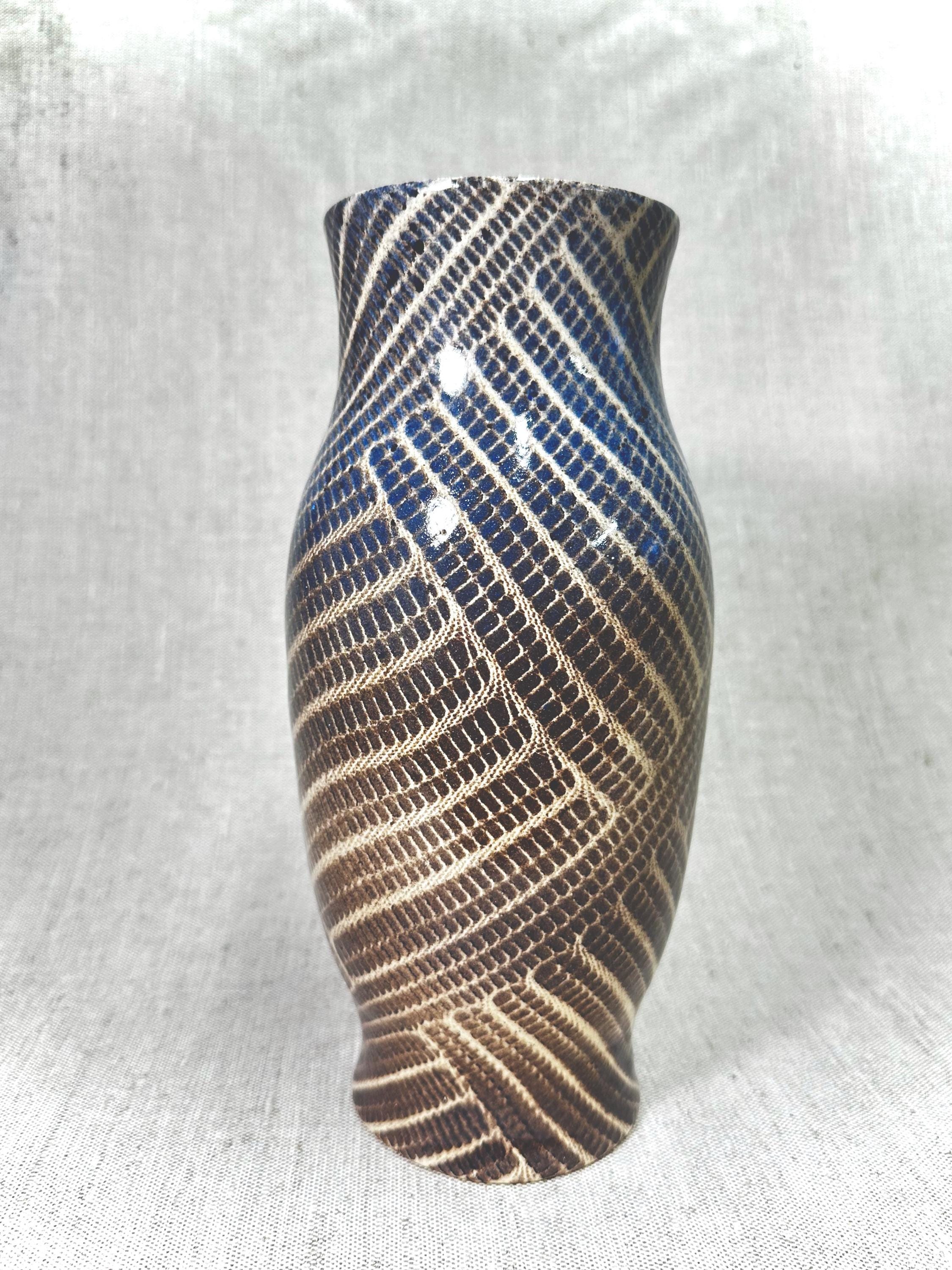 Decorative ceramic handmade tall Vase with an abstract pattern with blue, brow, black tones of glaze. One of kind pottery by Shawn.