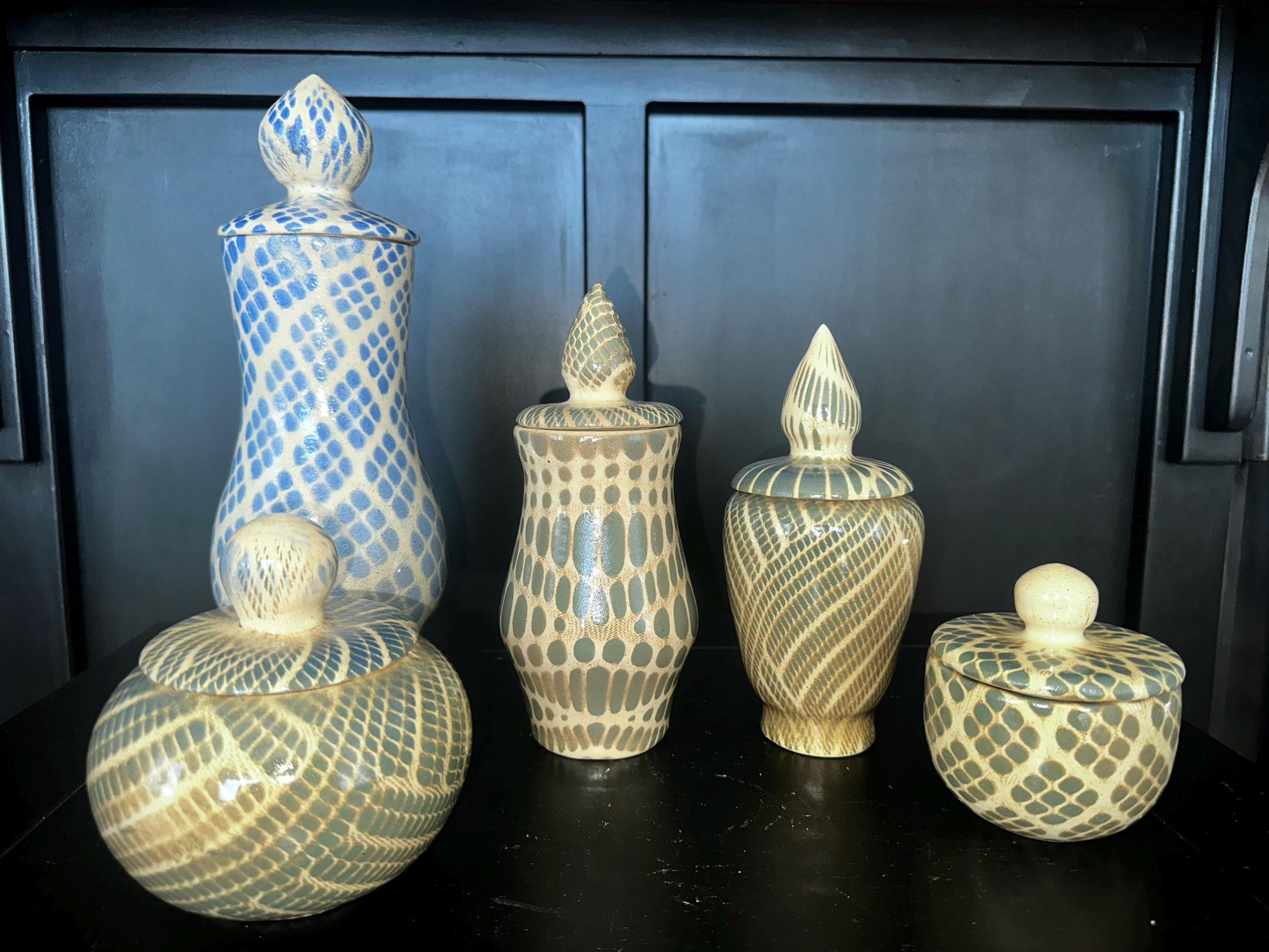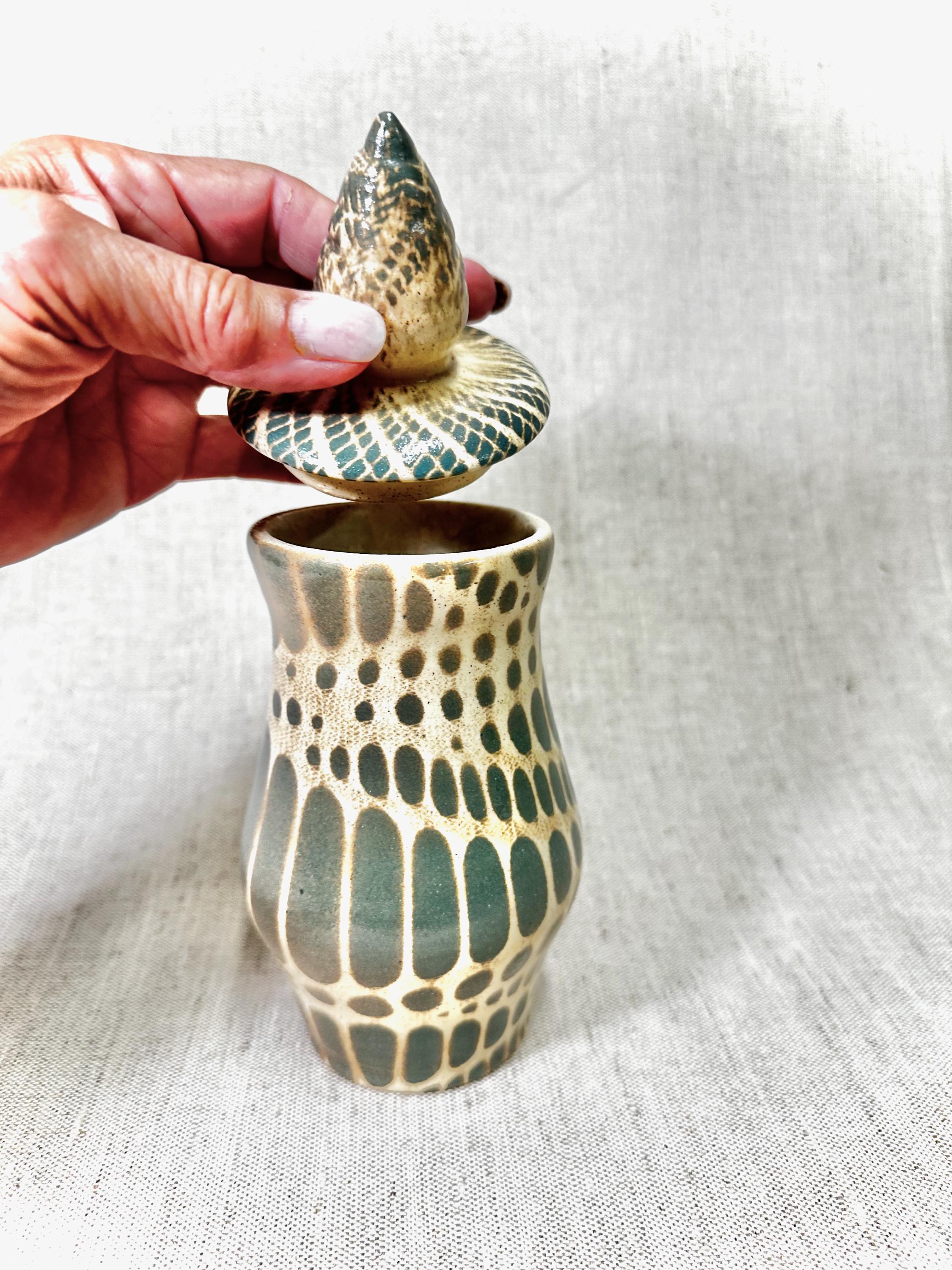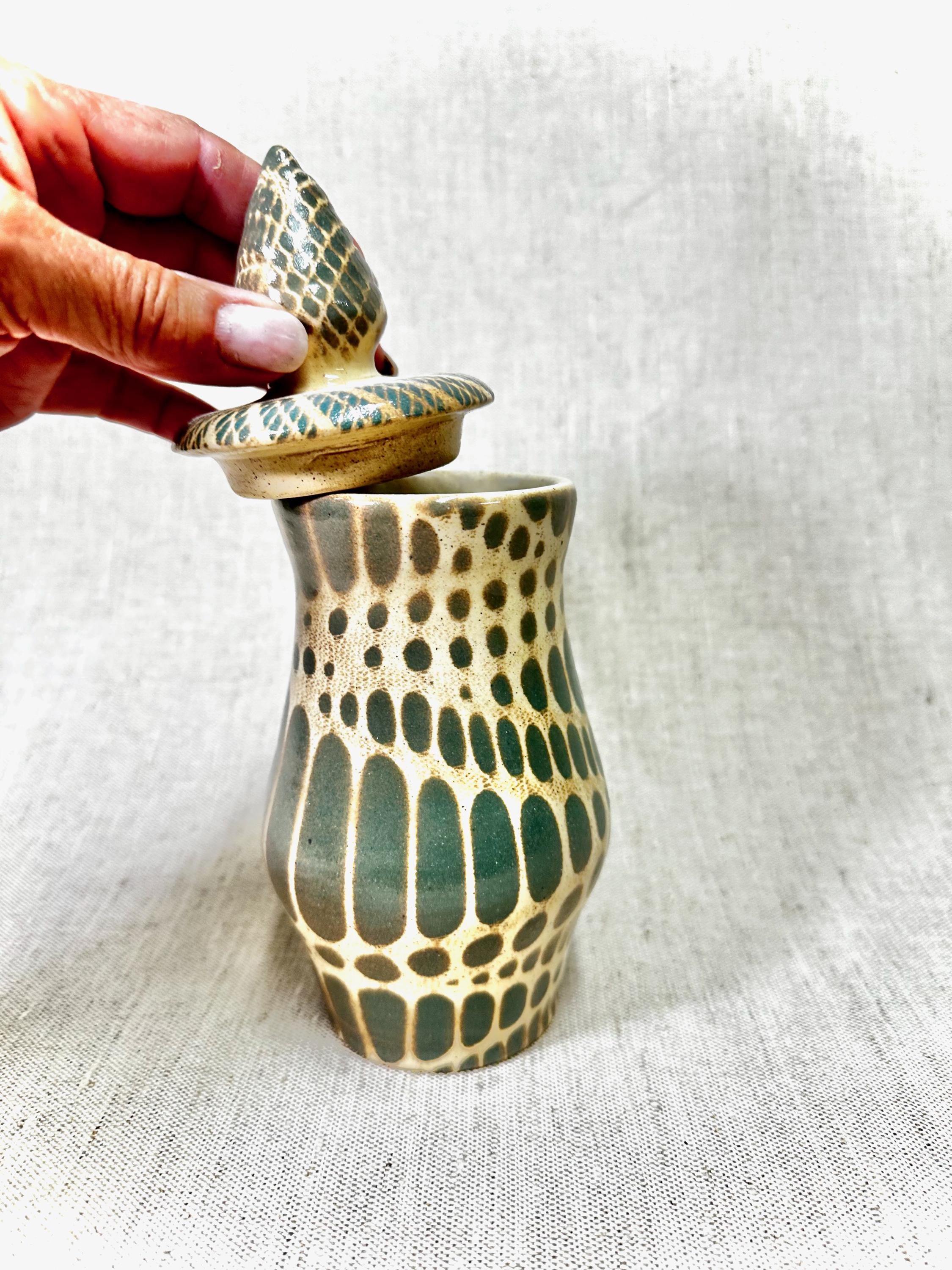 Decorative Abstract patterned Jar|HOME DECORHandmade by Shawn. tones of ash green and blue in the glaze pattern with a glossy finish.One of a Kind Artistic Potterycolors may vary in the photos.