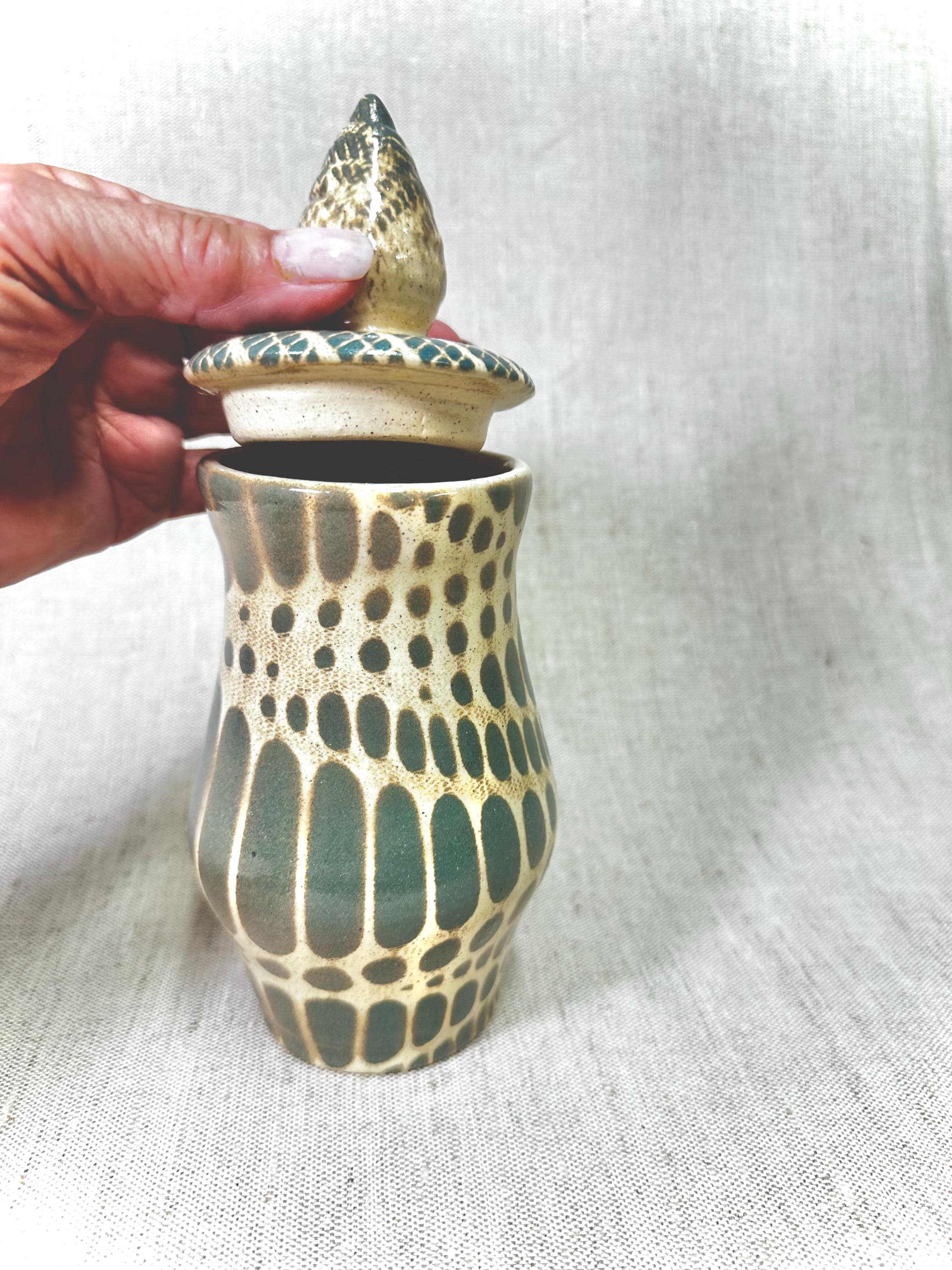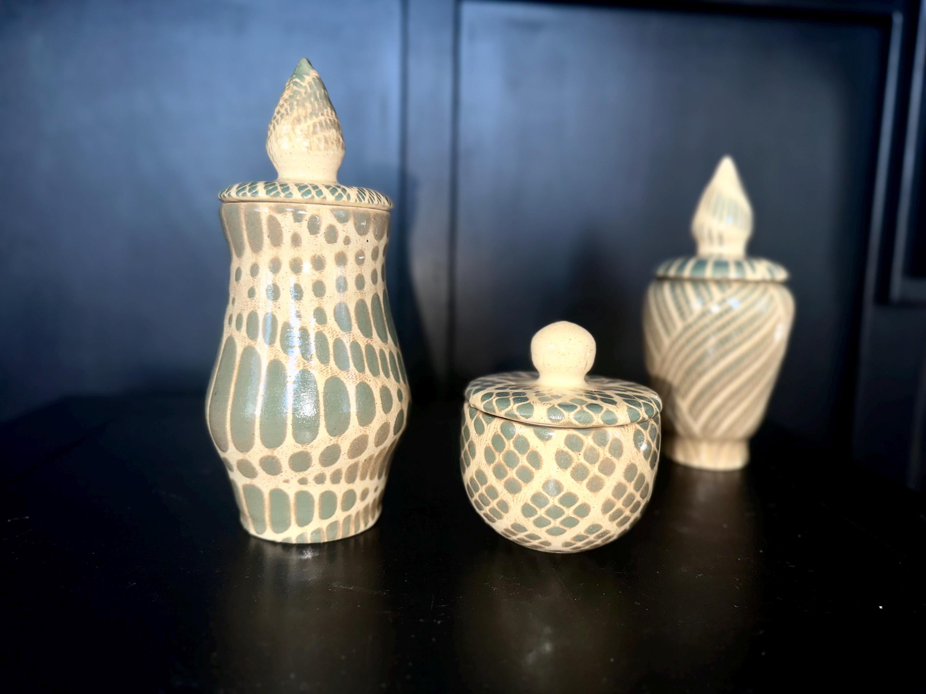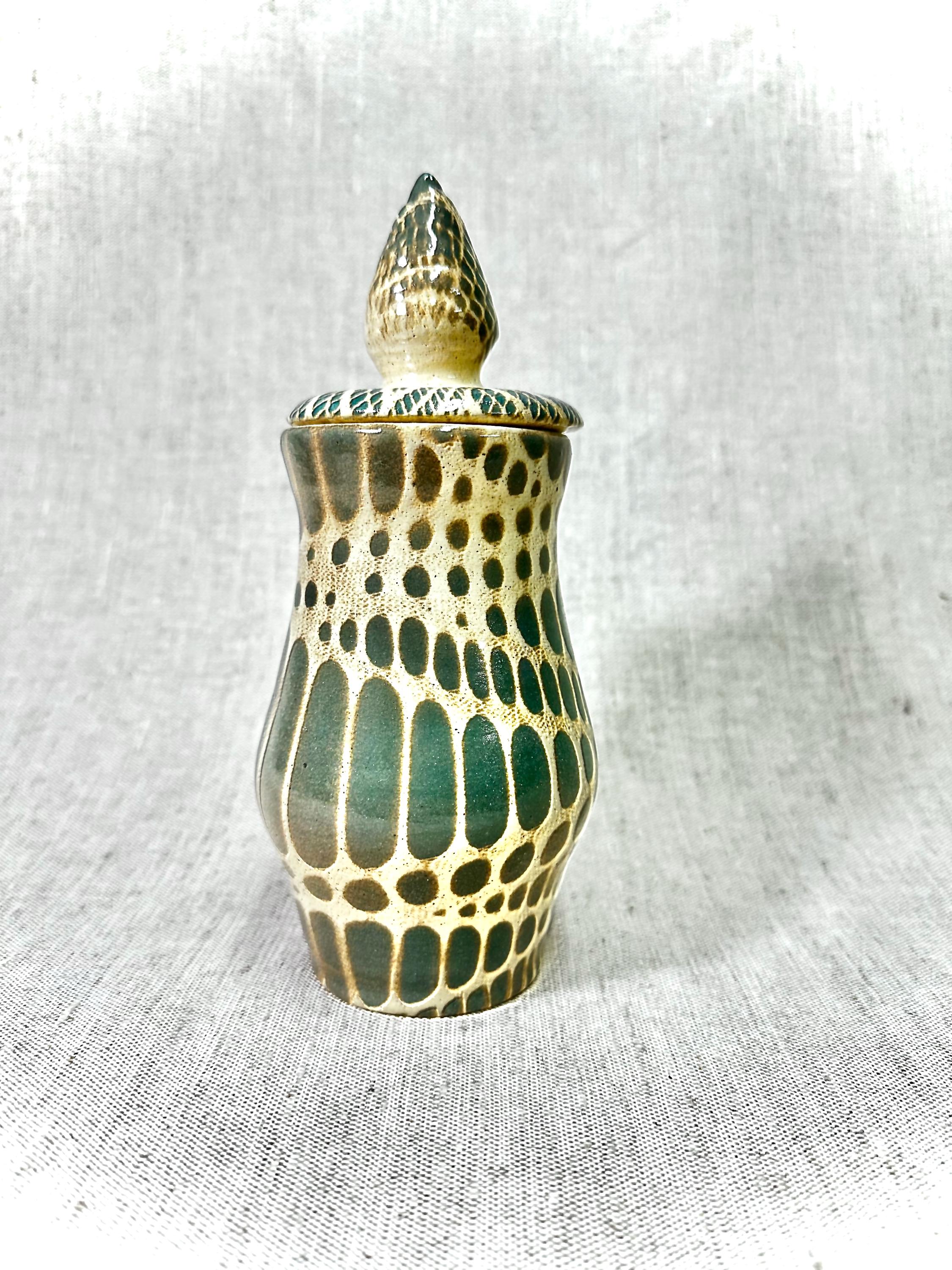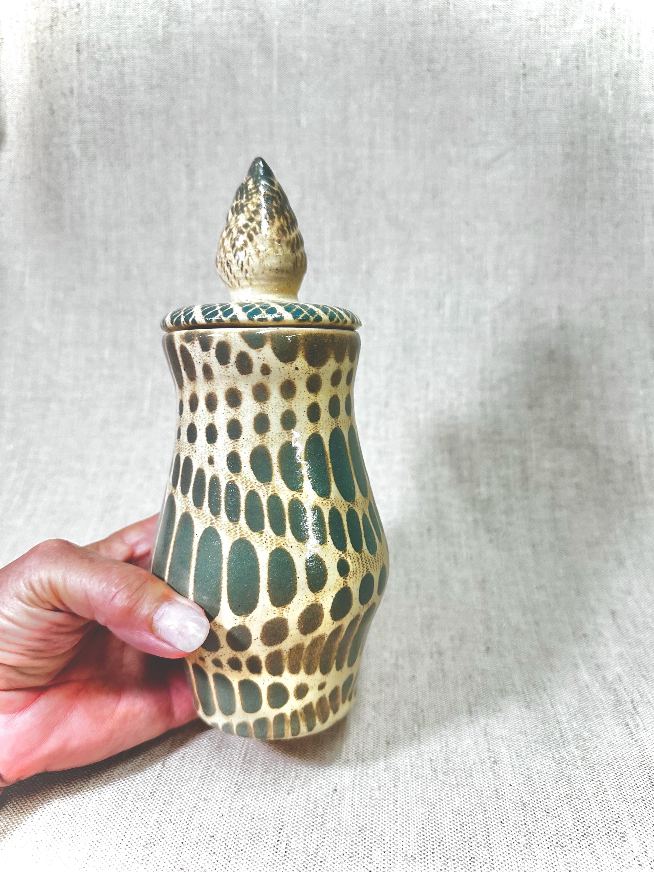 Decorative Abstract patterned Jar|HOME DECORHandmade by Shawn. tones of ash green and blue in the glaze pattern with a glossy finish.One of a Kind Artistic Potterycolors may vary in the photos.