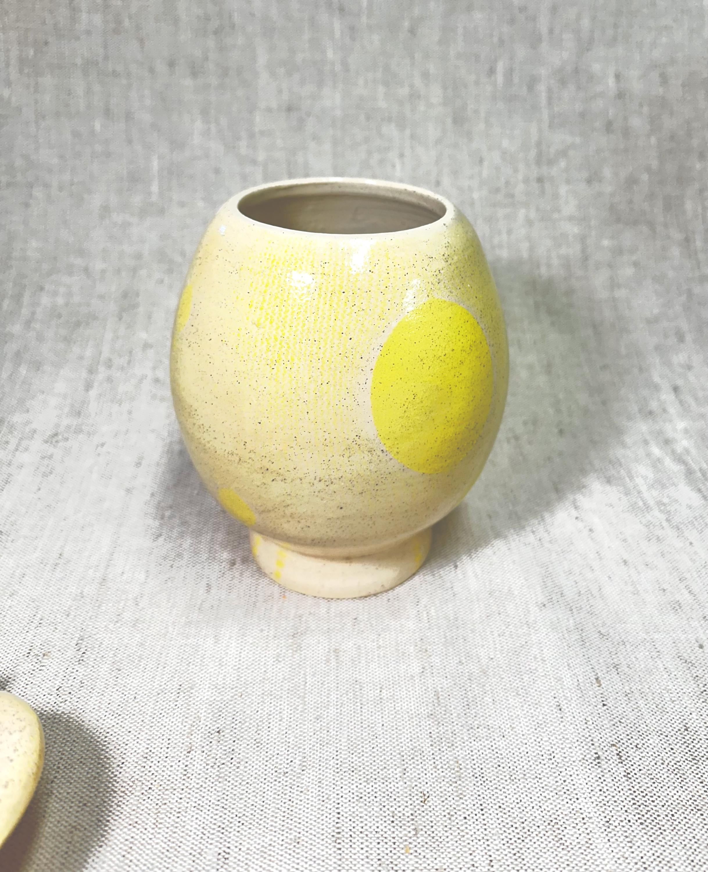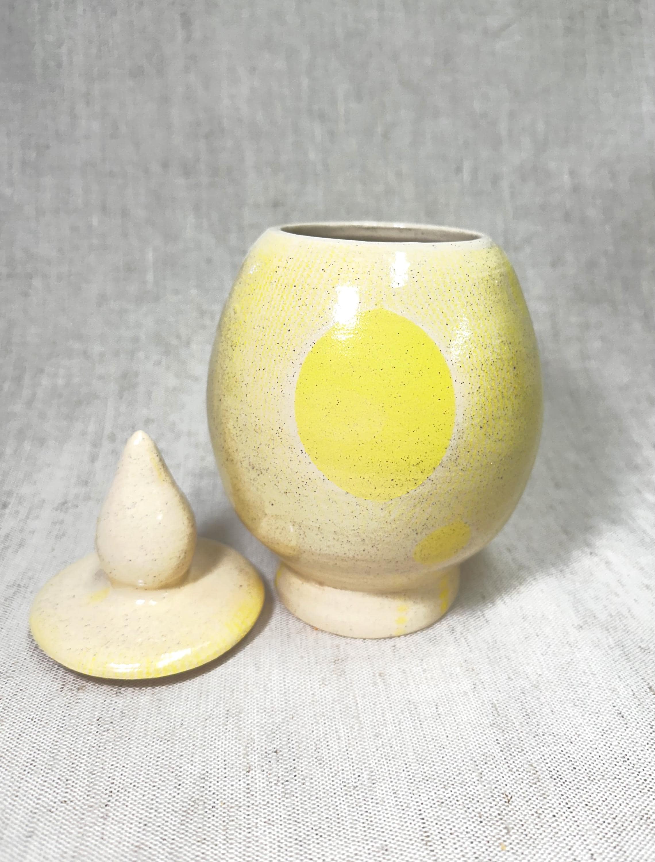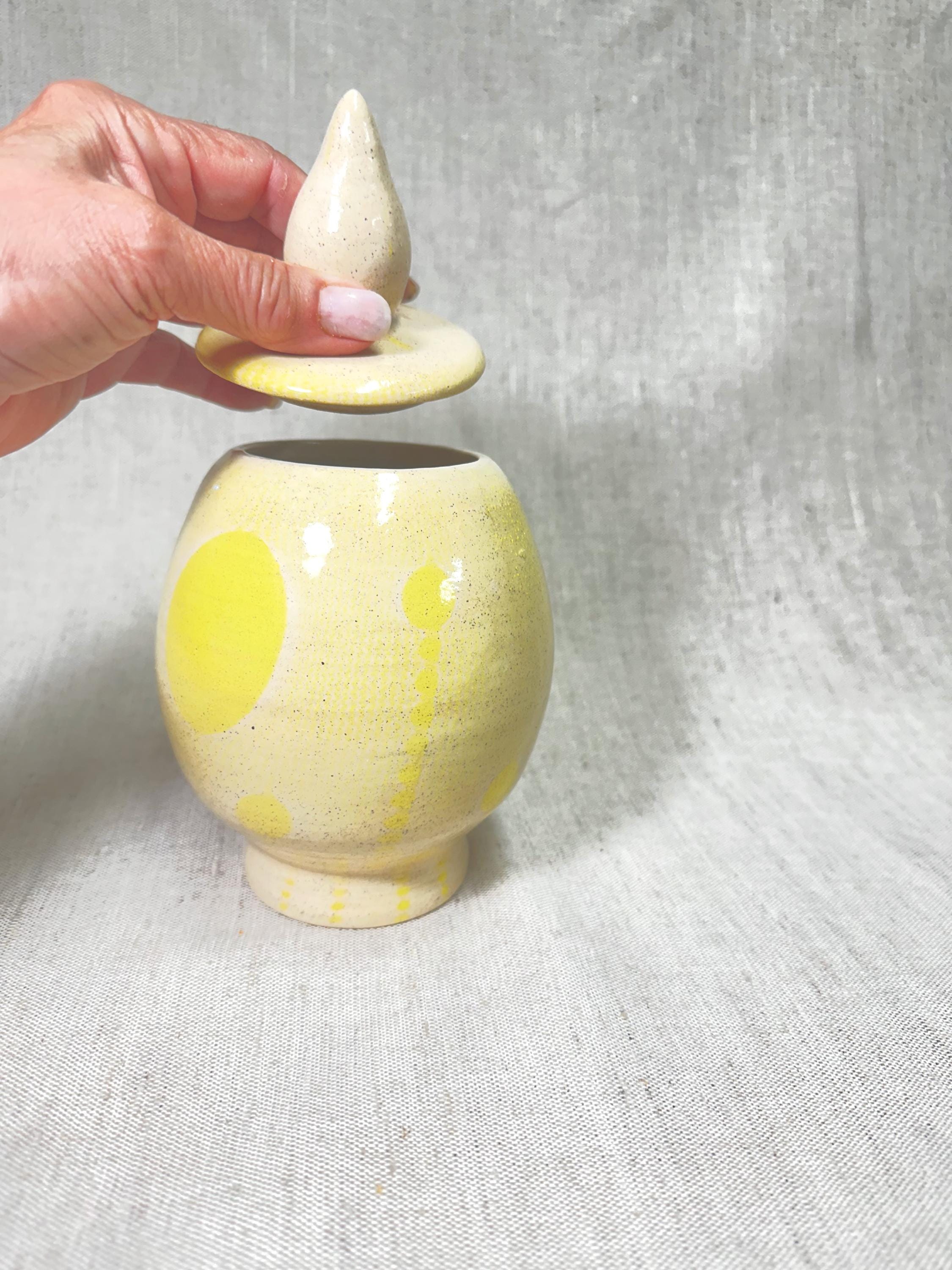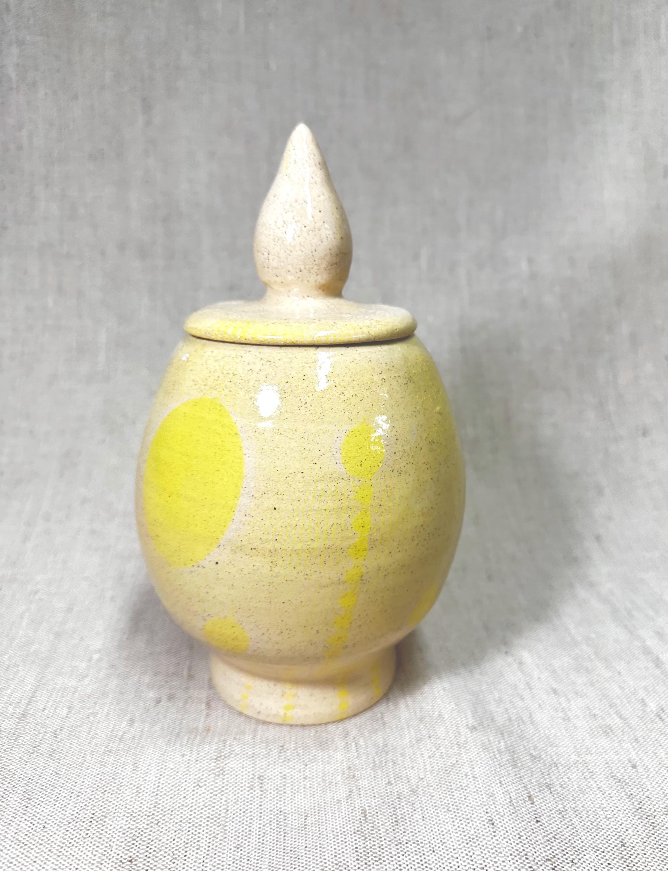 Decorative container with a lid. Hand made by Shawn with a yellow abstract patterned glaze. This jar\container is one of a kind.