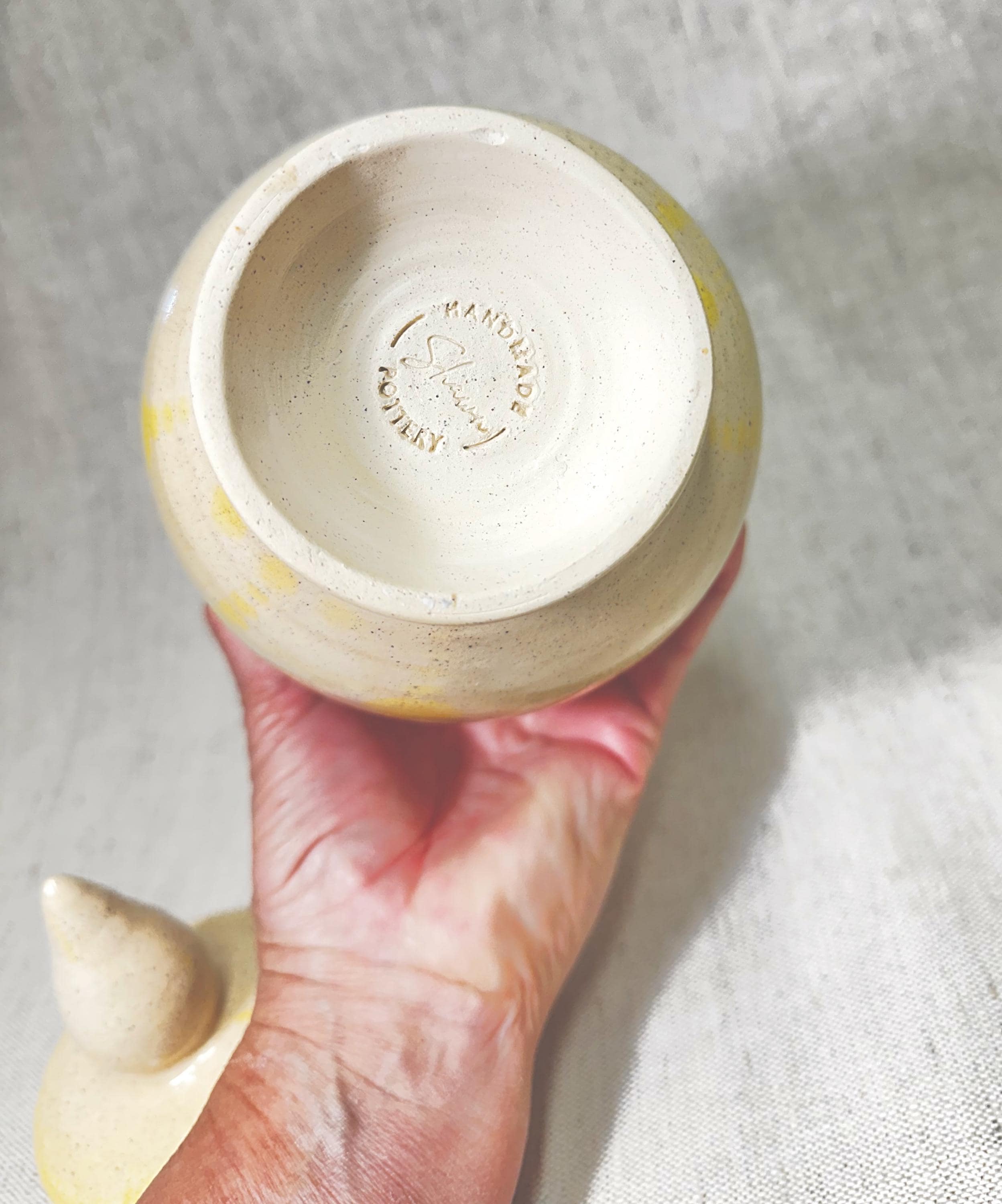Handmade by Shawn. Yellow glaze pattern with a glossy finish.